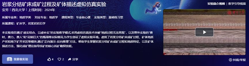 本实验项目通过“虚实结合、以虚补实”的实验教学模式,采用虚拟仿真技术突破“地质过程无法再现”,以及野外实验的“费时,费力,费人”和“花销巨大”的瓶颈等实际情况,为学生创设了虚拟实验环境。虚拟了岩浆分结矿床成矿过程、矿体地质产状和地下矿开采区等模块,通过“正向演示-反向推理”方法,帮助学生掌握岩浆分结矿床成矿过程和地质特征,以及矿体描述方法,强化成矿理论指导找矿的核心找矿勘探技能。
